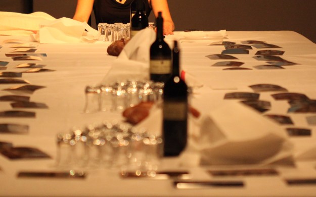 Je réunis les spectateurs autour d’une grande table dressée, comme s’il s’agissait des membres de ma famille. Sur de grandes nappes blanches, sont disposés des verres, du pain, des bouteilles de vin sicilien (du Nero d’Avola), des carafes d’eau et des assiettes recouvertes de serviettes. Au cours du spectacle je découvre ces assiettes pour proposer au public de goûter avec moi ce fromage au poivre.